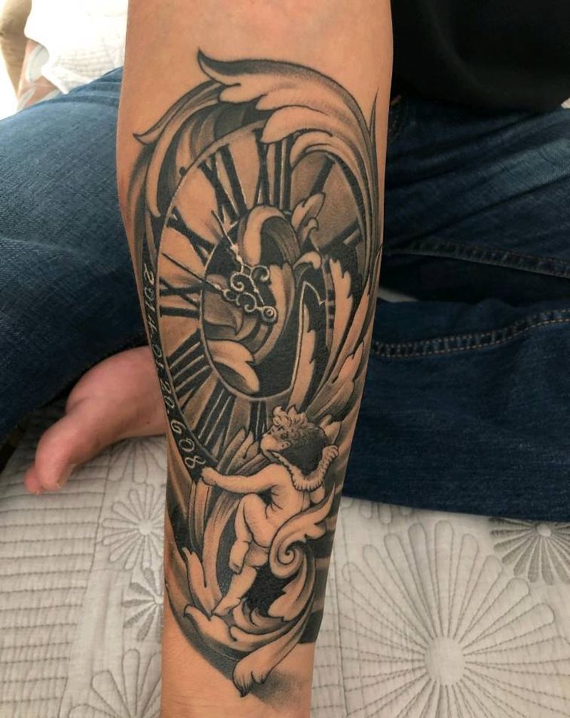 当前位置: 首页 >云南省昆明市纹身店-纹身工作室纹身图案>钟表纹身图片_欧美写实黑灰纹身图案
