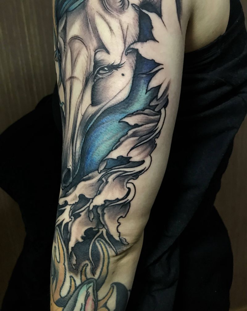 当前位置: 首页 >云南省昆明市纹身店-纹身工作室纹身图案>蓝色妖姬骏马纹身图片_手臂水彩欧美写实马叶子大臂纹身图案