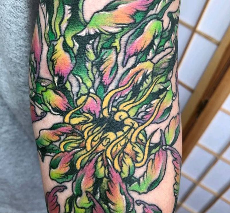 当前位置: 首页 >云南省昆明市纹身店-纹身工作室纹身图案>变形菊花纹身图片_手臂New School新传统菊花彩色麻花纹身图案