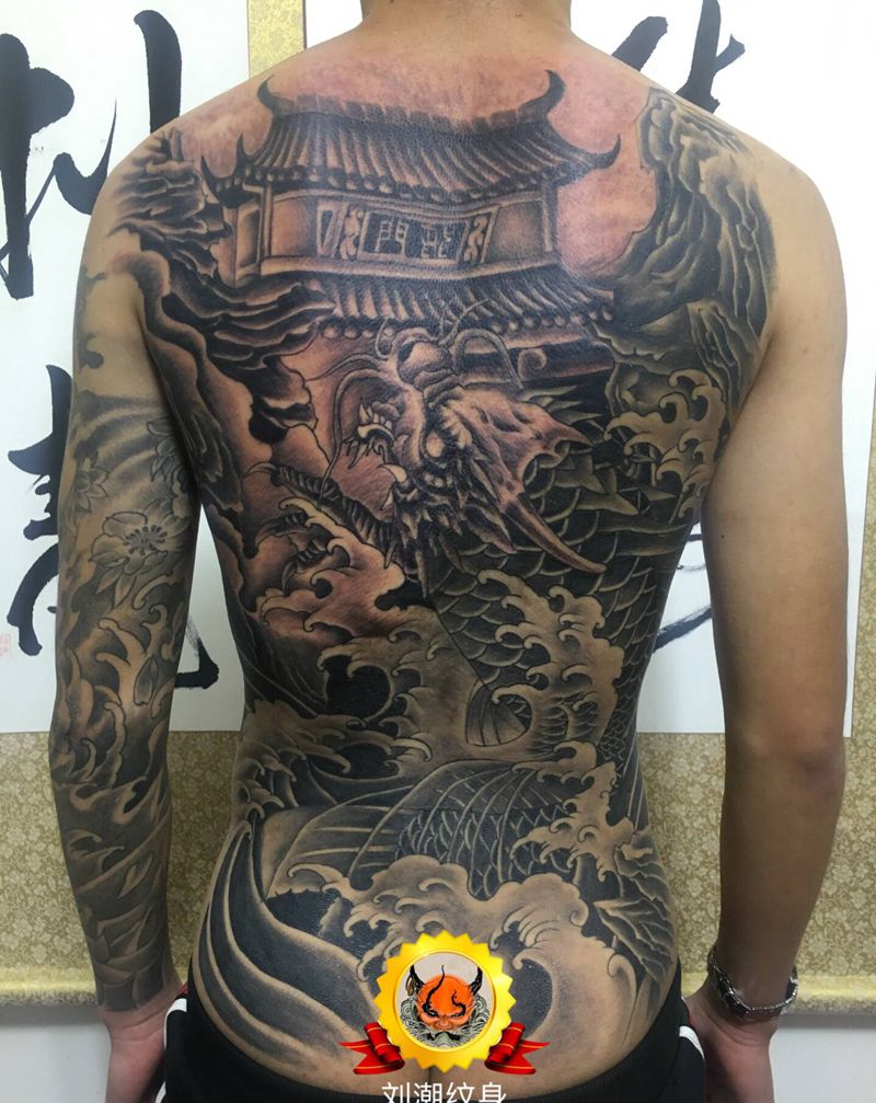 鲤鱼跳龙门纹身图片_背部新传统纹身图案