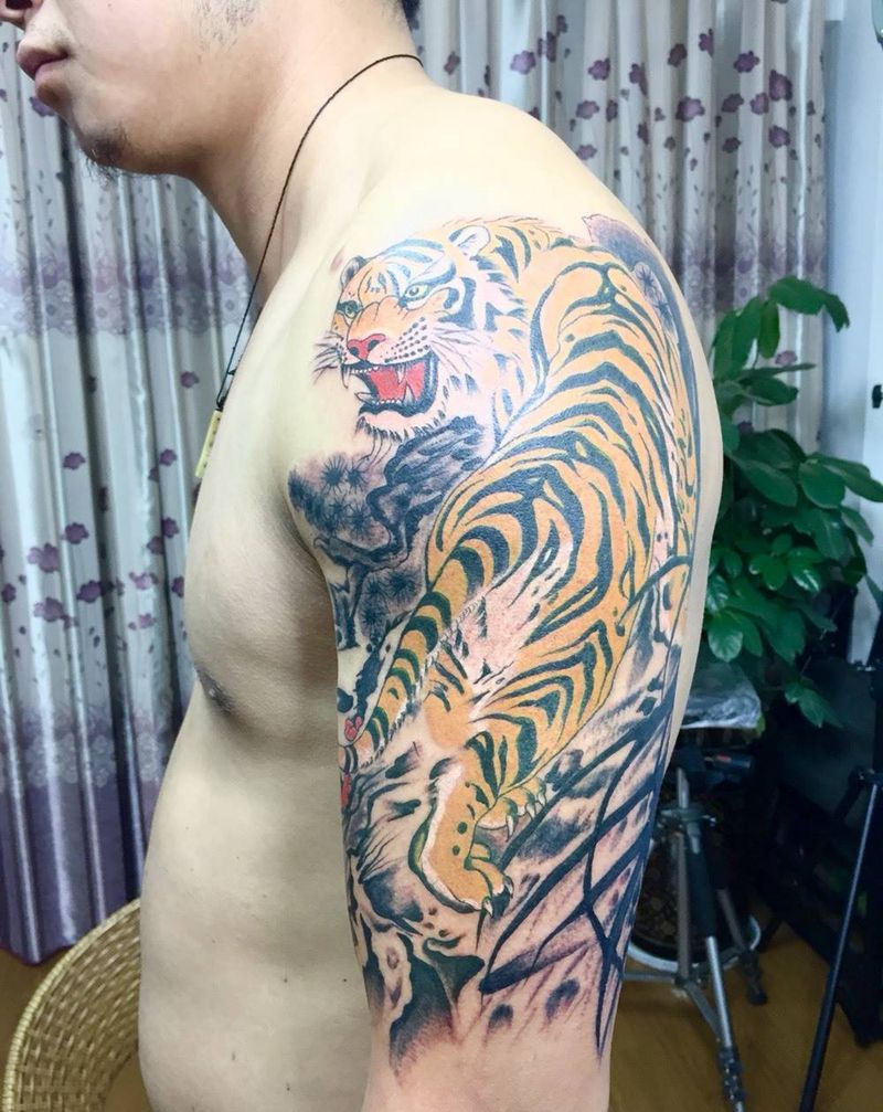 当前位置: 首页 >云南省昆明市纹身店-村夫纹身私人定制会所纹身图案>大臂老虎纹身图片_成品肩部手臂手部传统动物纹身图案