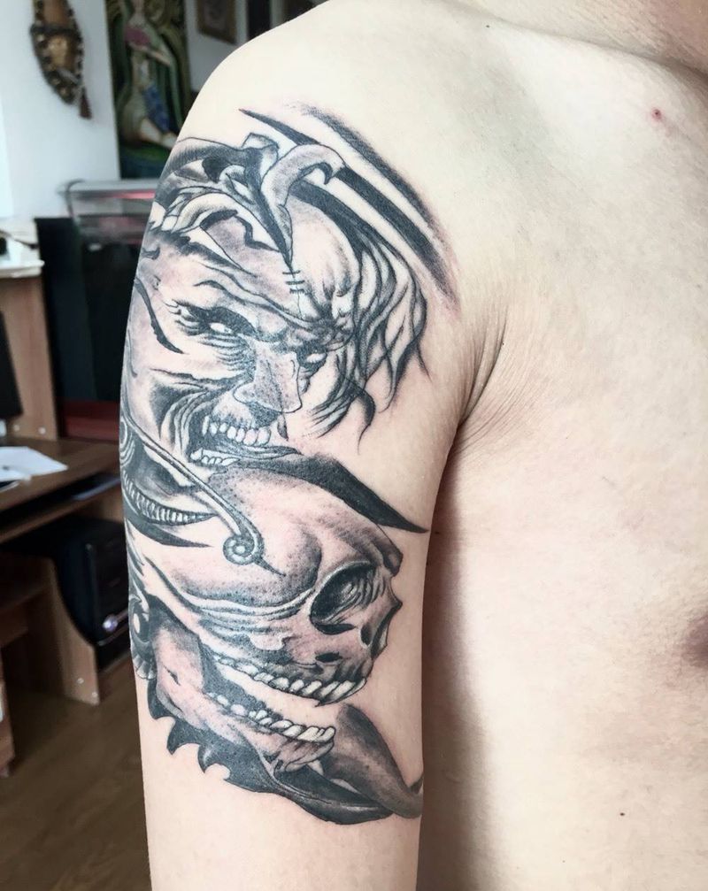 大臂骷髅纹身图片_成品手臂手部传统鬼神纹身图案