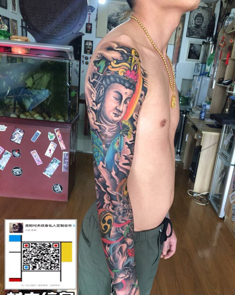 当前位置: 首页 >云南省昆明市纹身店-村夫纹身私人定制会所纹身图案>佛花臂纹身图片_成品手臂传统宗教纹身图案
