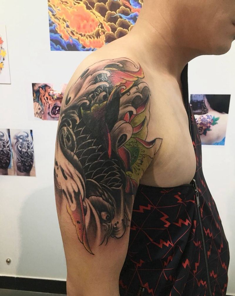 当前位置: 首页 >云南省昆明市纹身店-村夫纹身私人定制会所纹身图案>鲤鱼遮盖滴血狼头纹身图片_成品手臂传统动物纹身图案
