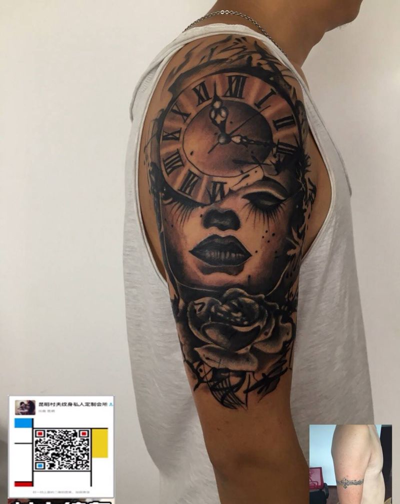 当前位置: 首页 >云南省昆明市纹身店-村夫纹身私人定制会所纹身图案>遮盖纹身图片_成品手臂欧美人物纹身图案
