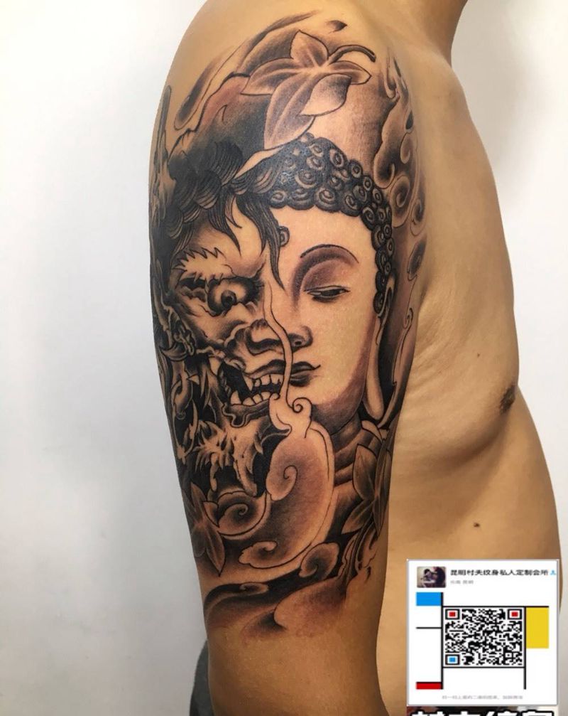 当前位置: 首页 >云南省昆明市纹身店-村夫纹身私人定制会所纹身图案>一念之间纹身图片_成品手臂传统宗教纹身图案