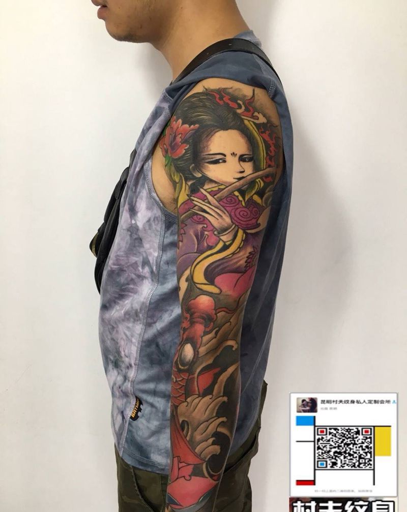 当前位置: 首页 >云南省昆明市纹身店-村夫纹身私人定制会所纹身图案>鲤鱼花旦纹身图片_成品手臂传统人物纹身图案