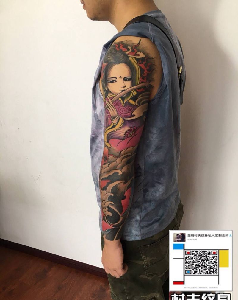 当前位置: 首页 >云南省昆明市纹身店-村夫纹身私人定制会所纹身图案>鲤鱼花旦纹身图片_成品手臂传统人物纹身图案