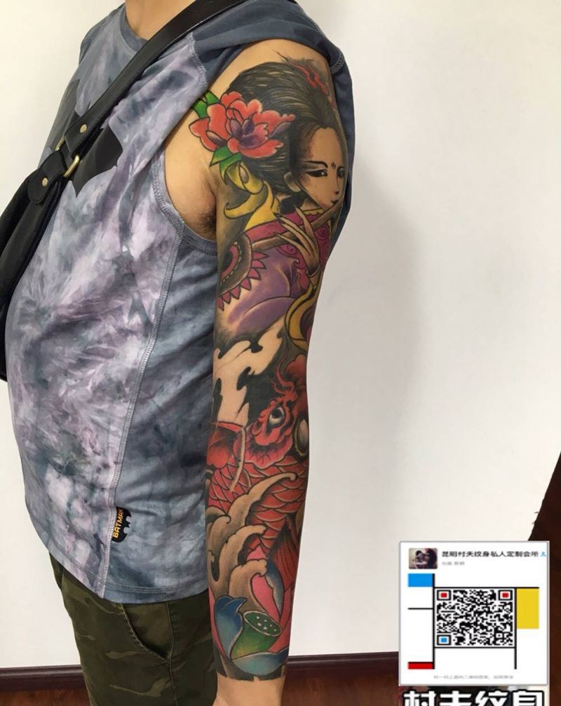 当前位置: 首页 >云南省昆明市纹身店-村夫纹身私人定制会所纹身图案>鲤鱼花旦纹身图片_成品手臂传统人物纹身图案