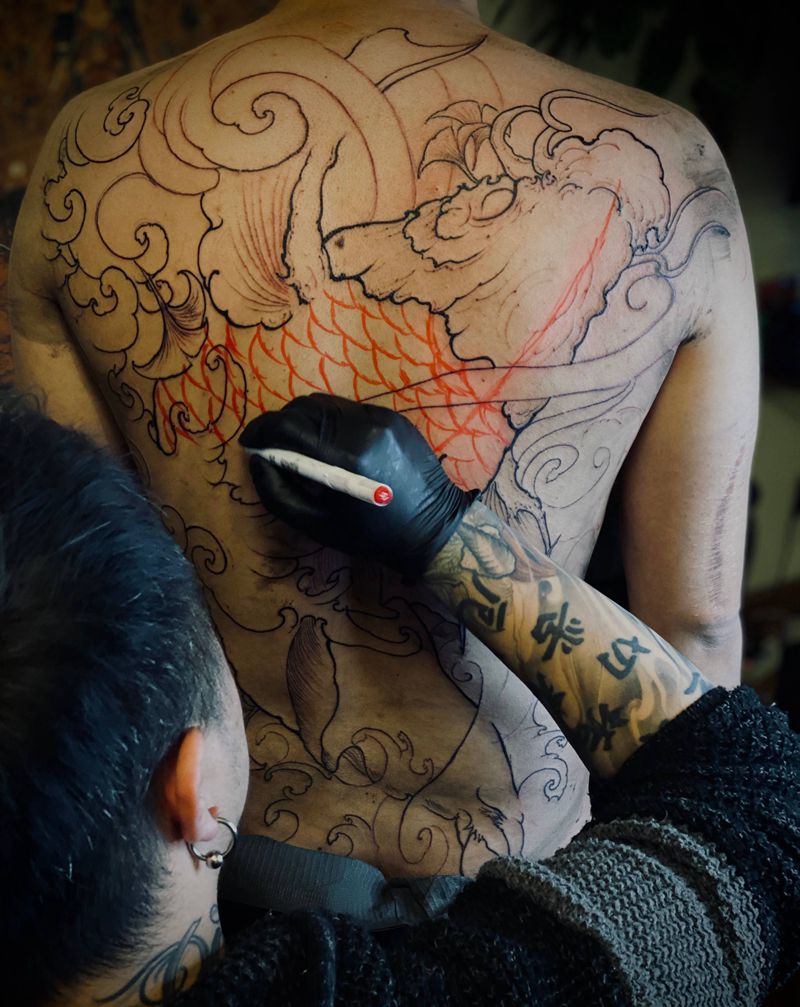 当前位置: 首页 >云南省昆明市纹身店-禅刺青艺术工作室纹身图案>满背锦鲤纹身图片_新传统纹身图案