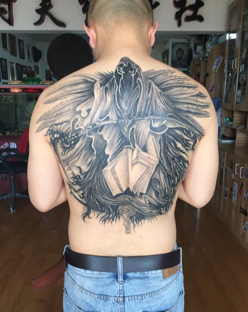 当前位置: 首页 >云南省昆明市纹身店-村夫纹身私人定制会所纹身图案>死神纹身图片_成品背部传统宗教纹身图案
