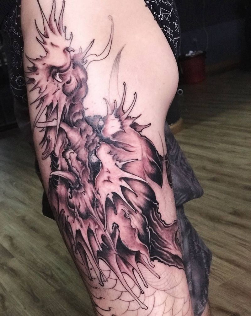 • T网红王老大花腿龙纹身图片_腿部新传统纹身图案
