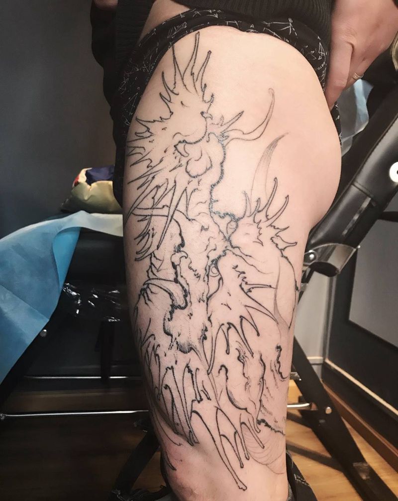 • T网红王老大花腿龙纹身图片_腿部新传统纹身图案