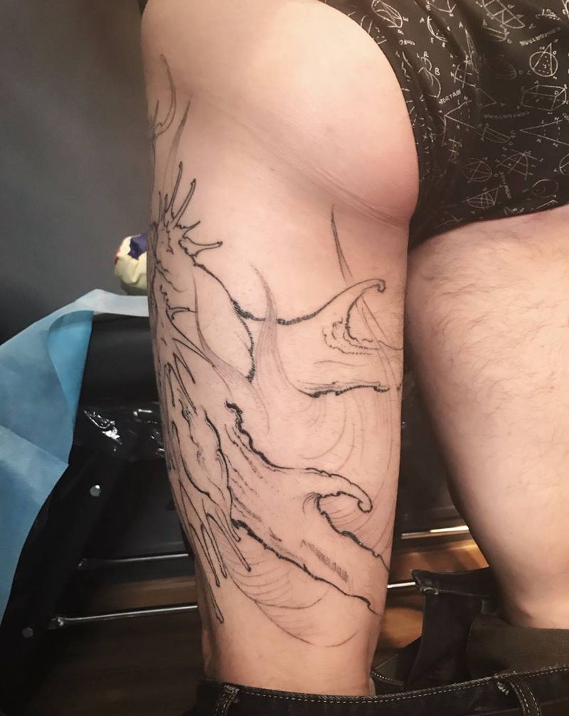 • T网红王老大花腿龙纹身图片_腿部新传统纹身图案