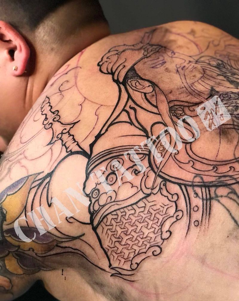 当前位置: 首页 >云南省昆明市纹身店-禅刺青艺术工作室纹身图案>满背进行中纹身图片