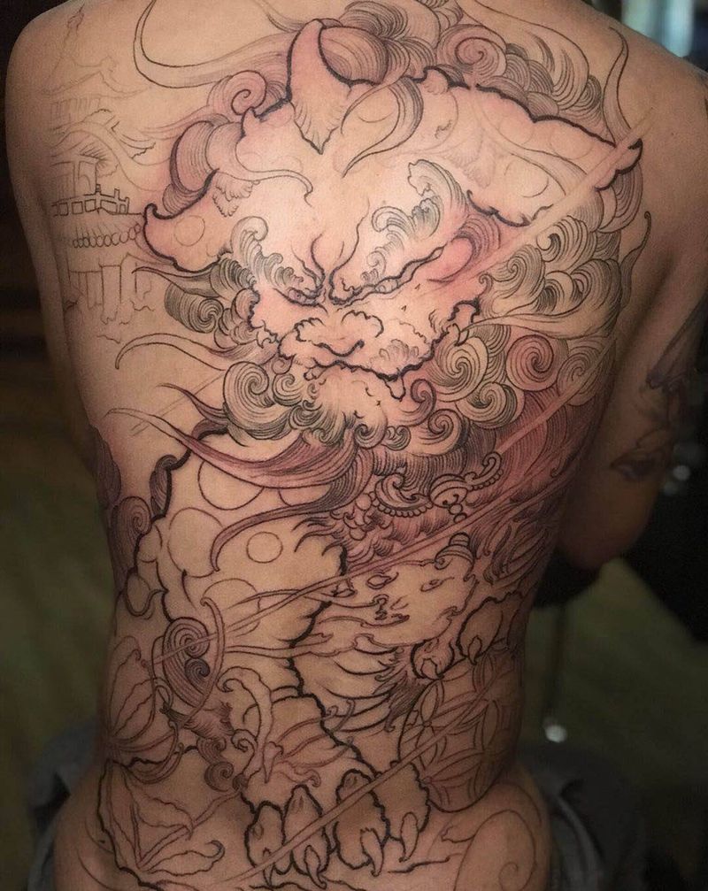 当前位置: 首页 >云南省昆明市纹身店-禅刺青艺术工作室纹身图案>满背唐狮10%纹身图片