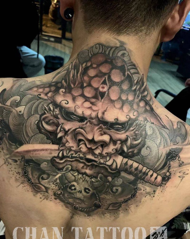 当前位置: 首页 >云南省昆明市纹身店-禅刺青艺术工作室纹身图案>守护纹身图片_背部新传统纹身图案