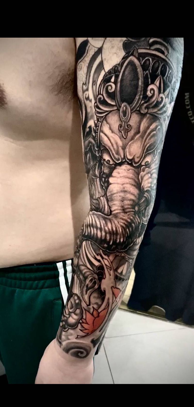 当前位置: 首页 >云南省昆明市纹身店-禅刺青艺术工作室纹身图案>象神花臂(未完)纹身图片_Old School新传统纹身图案
