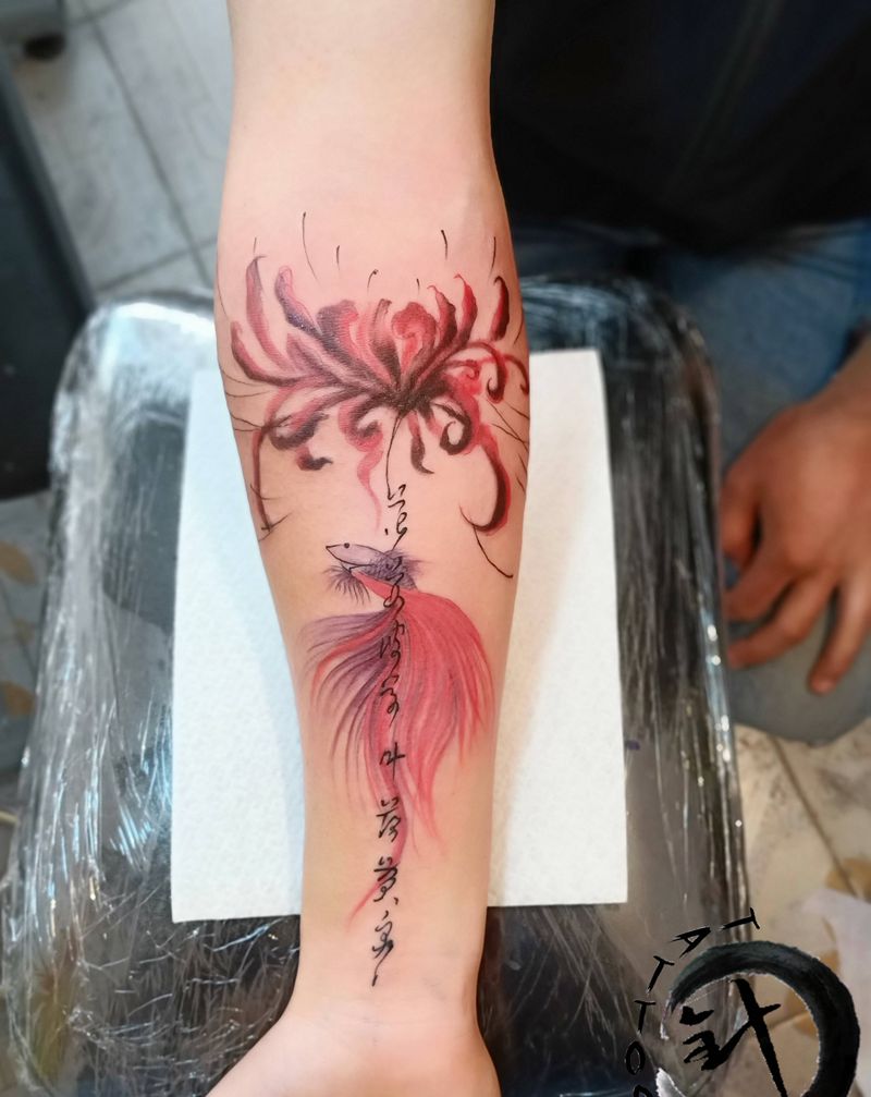 彼岸花纹身图片_手臂水彩水墨斗鱼彼岸花纹身图案