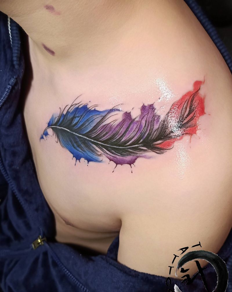 水彩羽毛 遮盖纹身图片_胸部肩部水彩羽毛遮盖水彩纹身图案