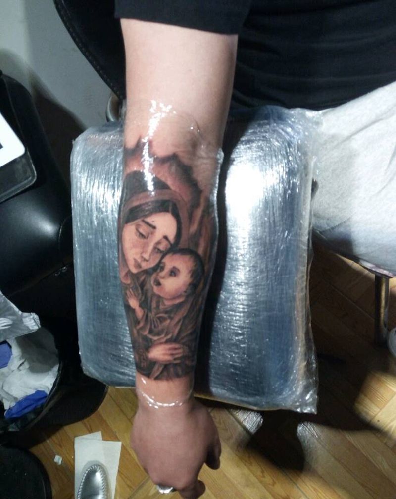 当前位置: 首页 >云南省昆明市纹身店-tattoo针尖下的艺术纹身图案>圣母纹身图片_手臂肖像人物原创小白刺青塔图 针成品纹身图案