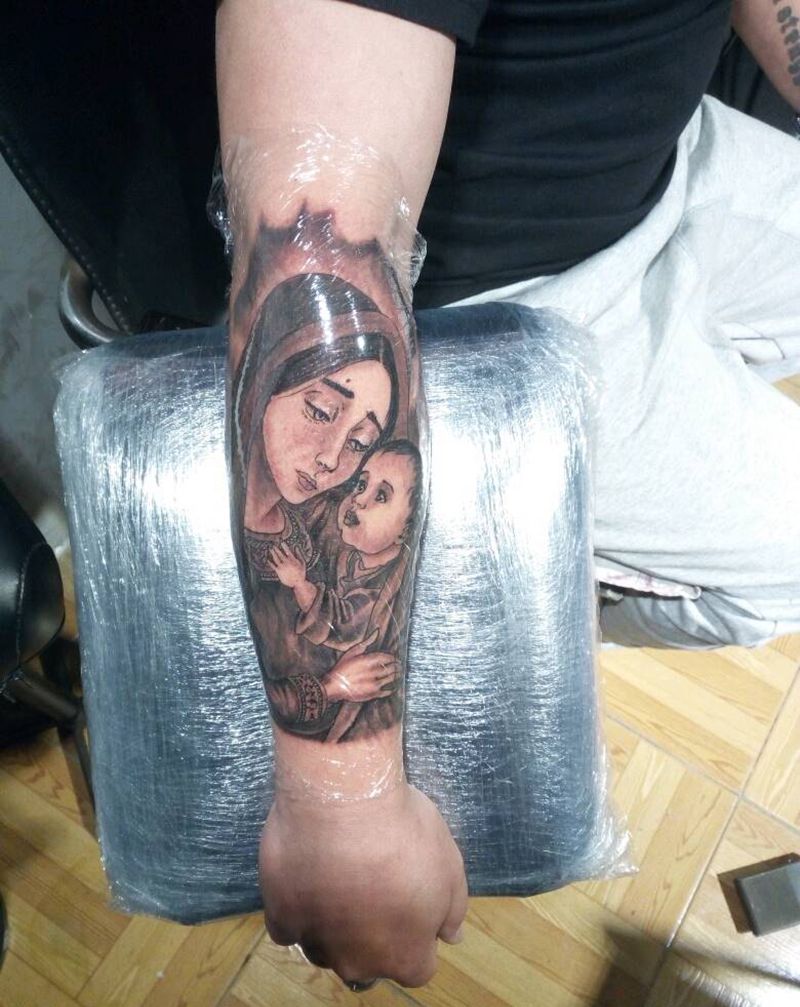 当前位置: 首页 >云南省昆明市纹身店-tattoo针尖下的艺术纹身图案>圣母纹身图片_手臂肖像人物原创小白刺青塔图 针成品纹身图案