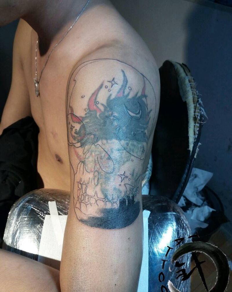 当前位置: 首页 >云南省昆明市纹身店-tattoo针尖下的艺术纹身图案>骷髅||遮盖纹身图片_手臂欧美原创小白刺青塔图~针遮盖成品纹身图案