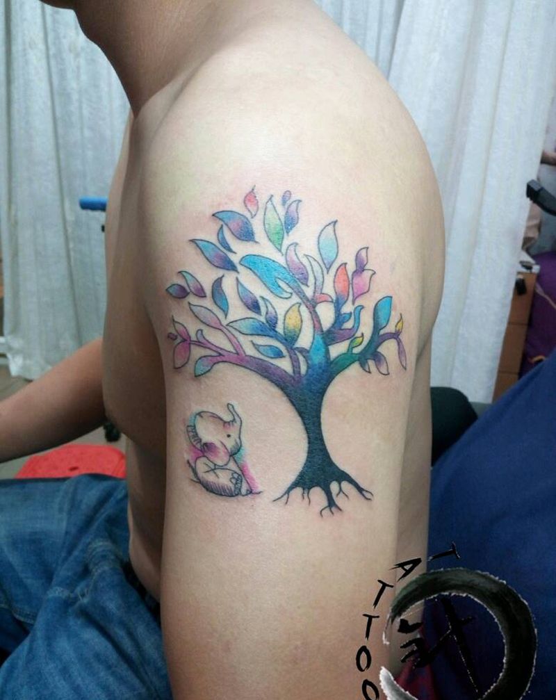 水彩象||树纹身图片_手臂动物植物原创小白刺青塔图 针水彩成品纹身图案
