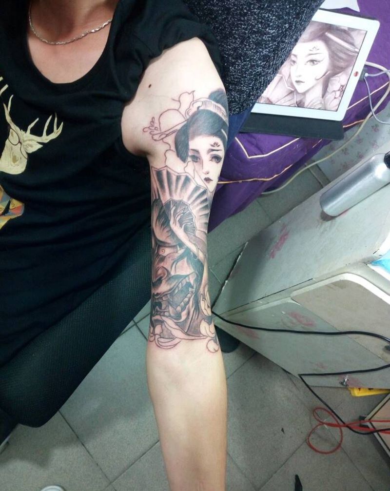 艺妓||包臂||未完…纹身图片_手臂传统人物原创小白刺青塔图~针半成品纹身图案