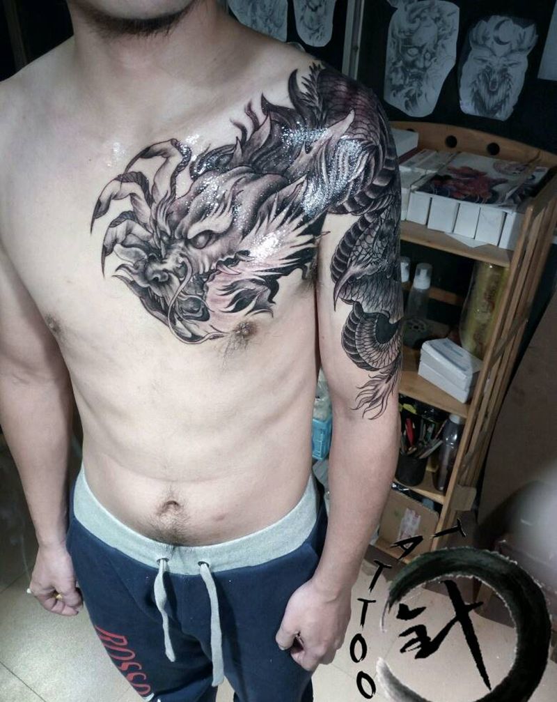 当前位置: 首页 >云南省昆明市纹身店-tattoo针尖下的艺术纹身图案>披肩龙||遮盖纹身图片_肩部胸部手臂传统动物原创小白刺青塔图~针遮盖成品纹身图案