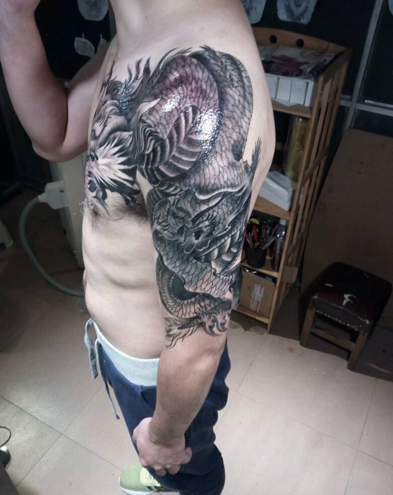 当前位置: 首页 >云南省昆明市纹身店-tattoo针尖下的艺术纹身图案>披肩龙||遮盖纹身图片_肩部胸部手臂传统动物原创小白刺青塔图~针遮盖成品纹身图案