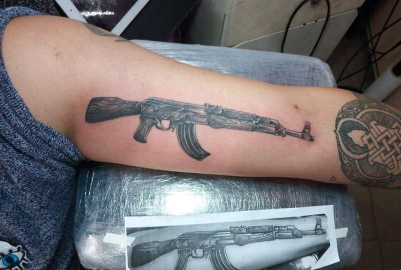 当前位置: 首页 >云南省昆明市纹身店-tattoo针尖下的艺术纹身图案>AK纹身图片_手臂写实静物原创小白刺青塔图~针成品纹身图案