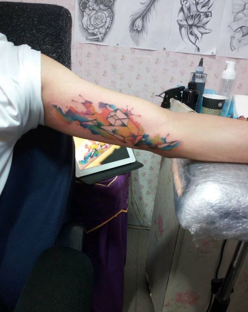 当前位置: 首页 >云南省昆明市纹身店-tattoo针尖下的艺术纹身图案>水彩纹身图片_手臂欧美几何原创小白刺青塔图~针成品纹身图案
