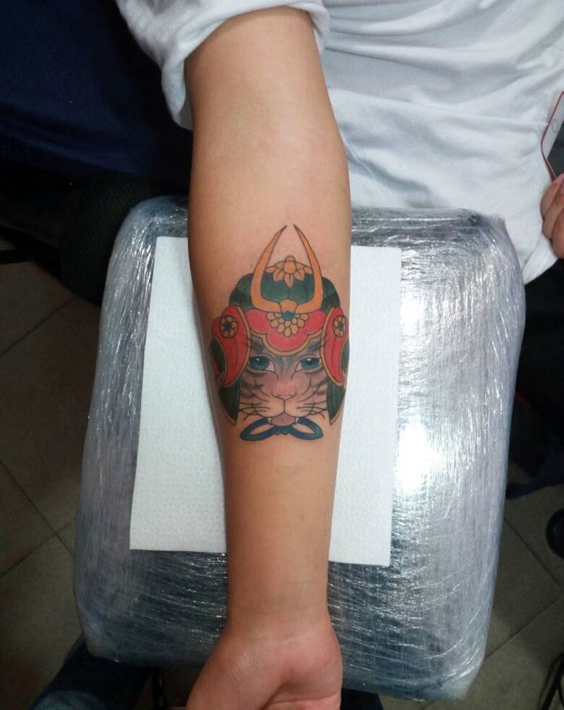 武士猫纹身图片_手臂欧美动物情侣原创小白刺青塔图~针成品纹身图案
