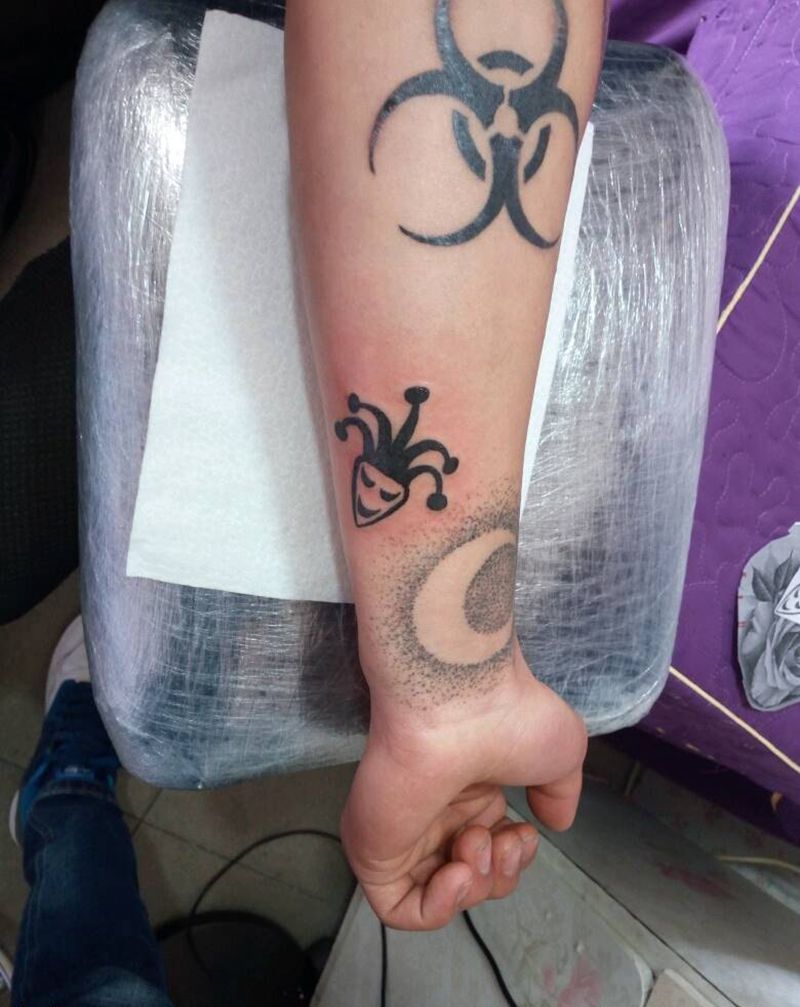当前位置: 首页 >云南省昆明市纹身店-tattoo针尖下的艺术纹身图案>小丑||图腾纹身图片_手臂清新图腾原创小白刺青塔图~针成品纹身图案