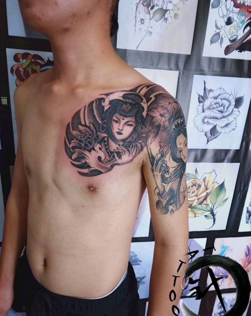 当前位置: 首页 >云南省昆明市纹身店-tattoo针尖下的艺术纹身图案>艺伎纹身图片_胸部手臂传统人物原创小小白刺塔图~针成品纹身图案