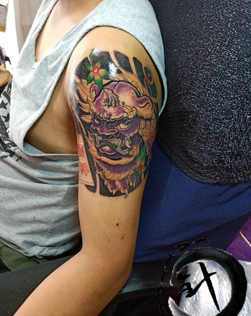 当前位置: 首页 >云南省昆明市纹身店-tattoo针尖下的艺术纹身图案>唐狮纹身图片_手臂老传统纹身图案