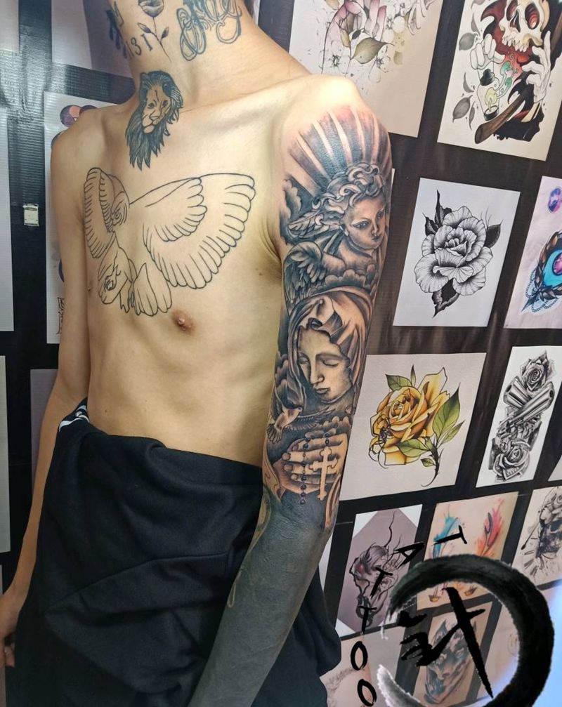 当前位置: 首页 >云南省昆明市纹身店-tattoo针尖下的艺术纹身图案>圣母接大臂纹身图片_手臂欧美写实圣母纹身图案