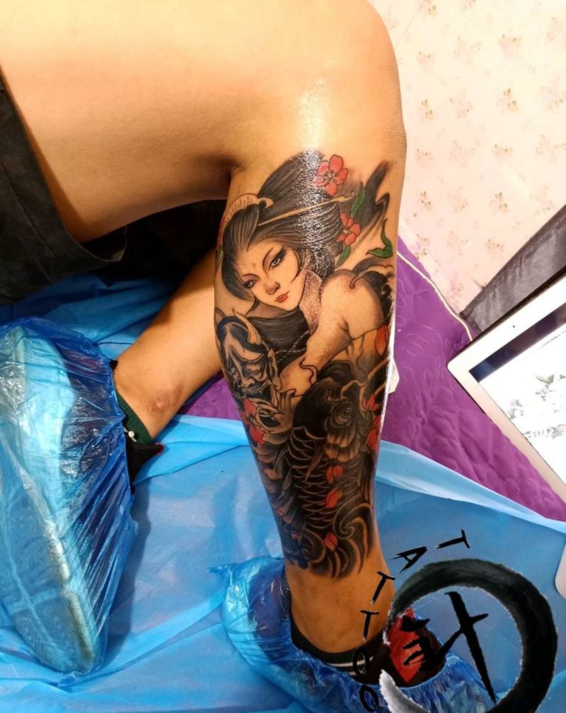 当前位置: 首页 >云南省昆明市纹身店-tattoo针尖下的艺术纹身图案>艺伎纹身图片_腿部老传统新传统纹身图案