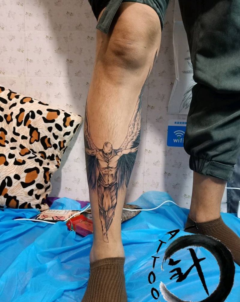 当前位置: 首页 >云南省昆明市纹身店-tattoo针尖下的艺术纹身图案>大天使纹身图片_腿部欧美写实水墨天使小腿纹身图案