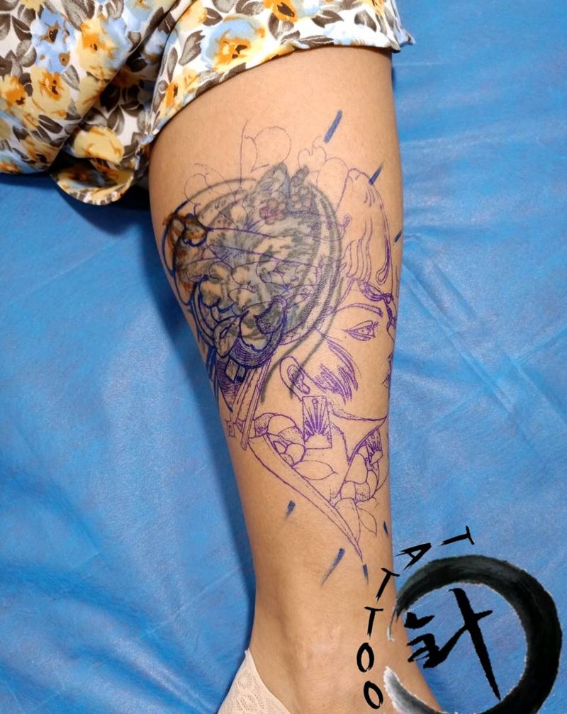 遮盖纹身图片_腿部艺妓遮盖纹身图案