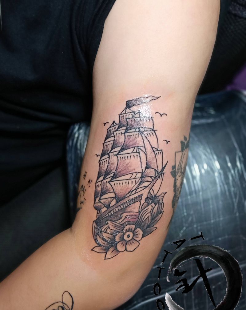 帆船纹身图片_手臂Old School帆船纹身图案