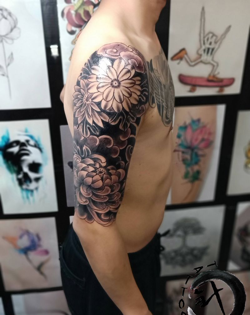 菊纹身图片_手臂老传统菊花纹身图案