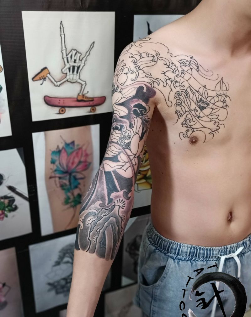 当前位置: 首页 >云南省昆明市纹身店-tattoo针尖下的艺术纹身图案>莲花半甲纹身图片_手臂胸部新传统老传统莲花半甲荷花纹身图案