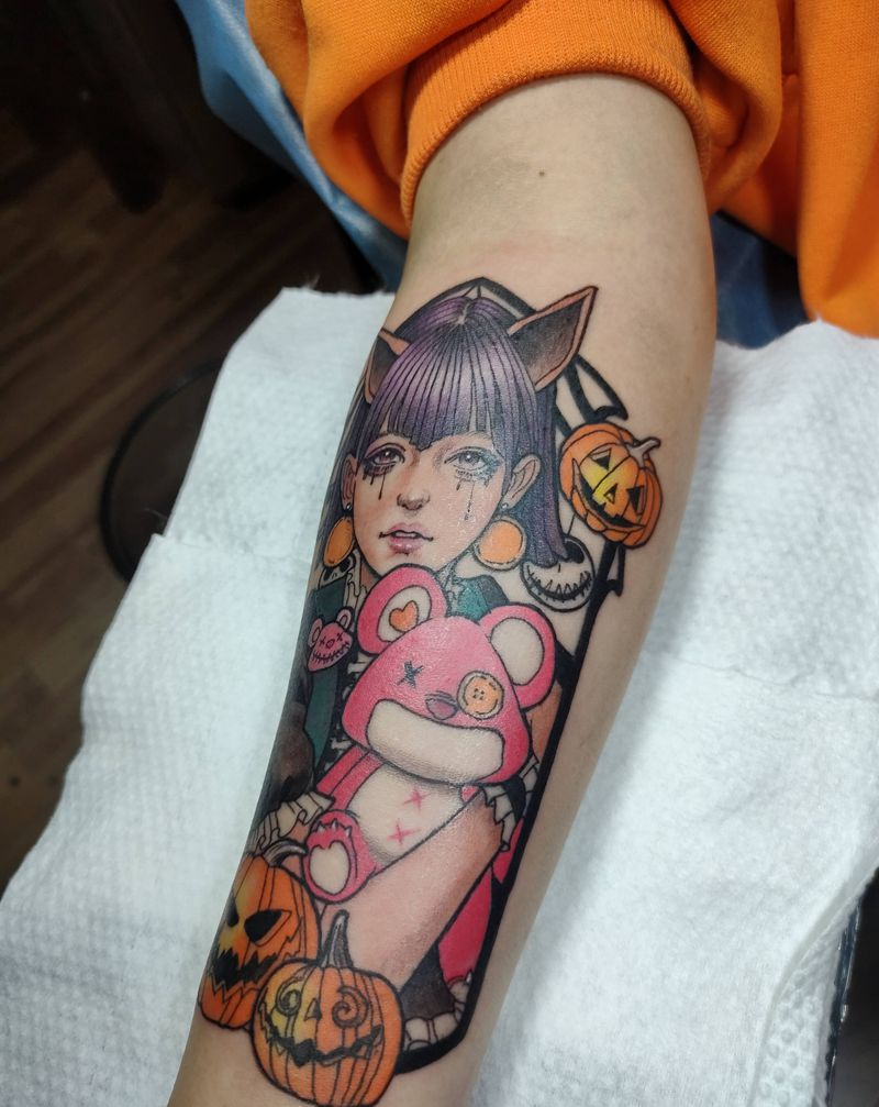 当前位置: 首页 >云南省昆明市纹身店-南無文畫刺青工作室纹身图案>小臂南瓜女孩纹身图片_手臂New School纹身图案