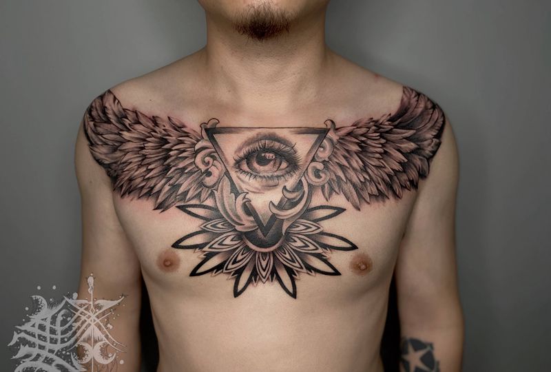翅膀纹身图片_胸部欧美写实纹身图案