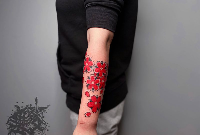 当前位置: 首页 >云南省昆明市纹身店-昆明魅纹身工作室纹身图案>樱花纹身图片_手臂手部新传统纹身图案