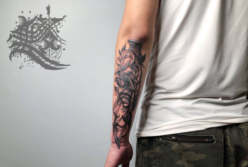当前位置: 首页 >云南省昆明市纹身店-昆明魅纹身工作室纹身图案>匕首纹身图片_手部手臂纹身图案