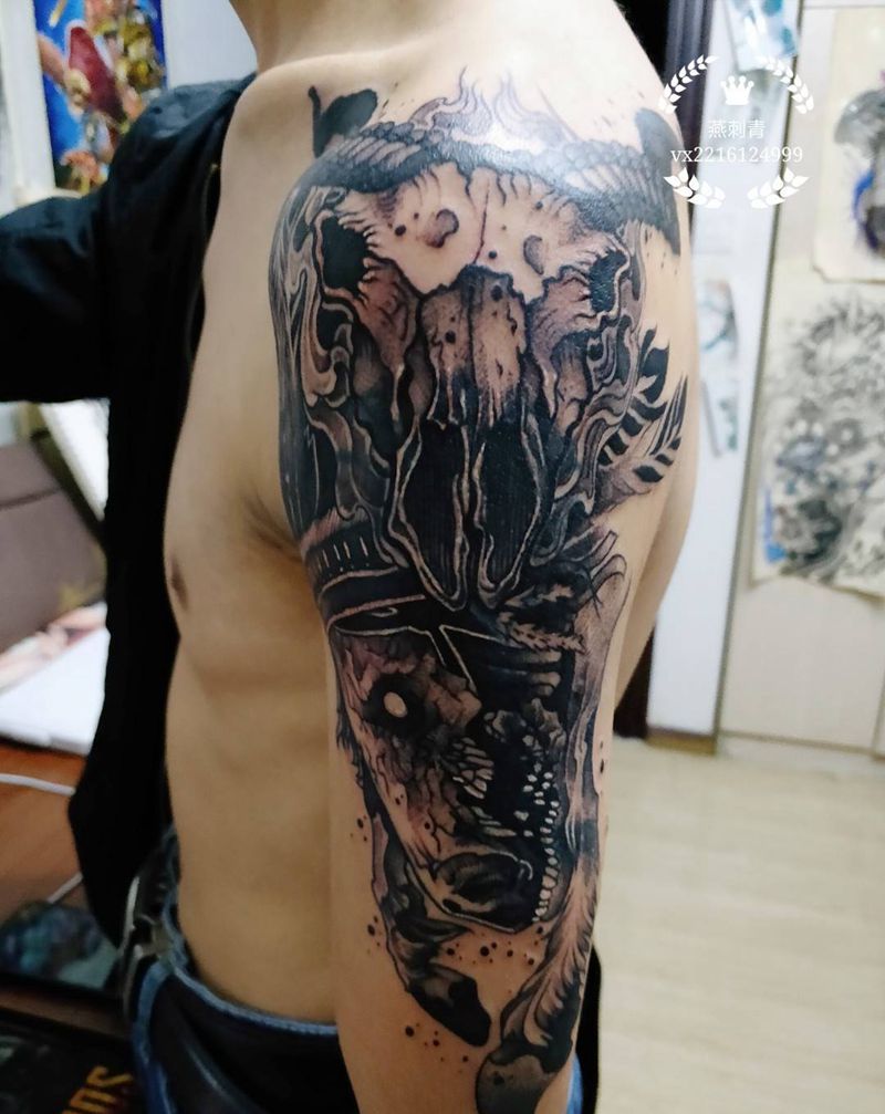 大臂,遮盖,生肖,灰黑,图稿纹身图片_手臂羊马遮盖纹身图案