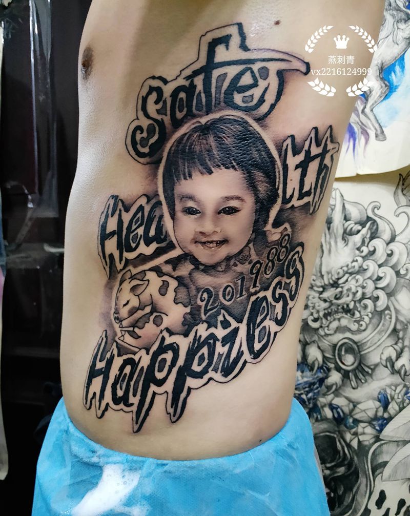肖像花体字结合设计纹身图片_腰部欧美写实写实肖像照片纹身图案